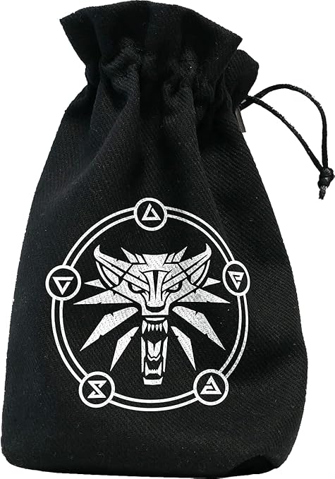 Q WORKSHOP presents The Witcher Dice Pouch. Geralt School of the Wolf. The color theme for this dice bag features a black background with a white-...